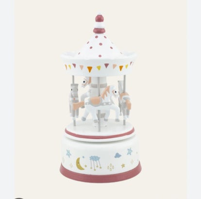 Carrousel en bois rouge, orné de petits chevaux. Dessin délicat et couleurs douces. Il est accompagné d'une musique jouant ''Be a clown'' par Cole Porter.